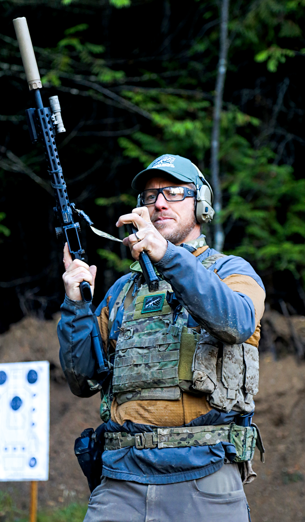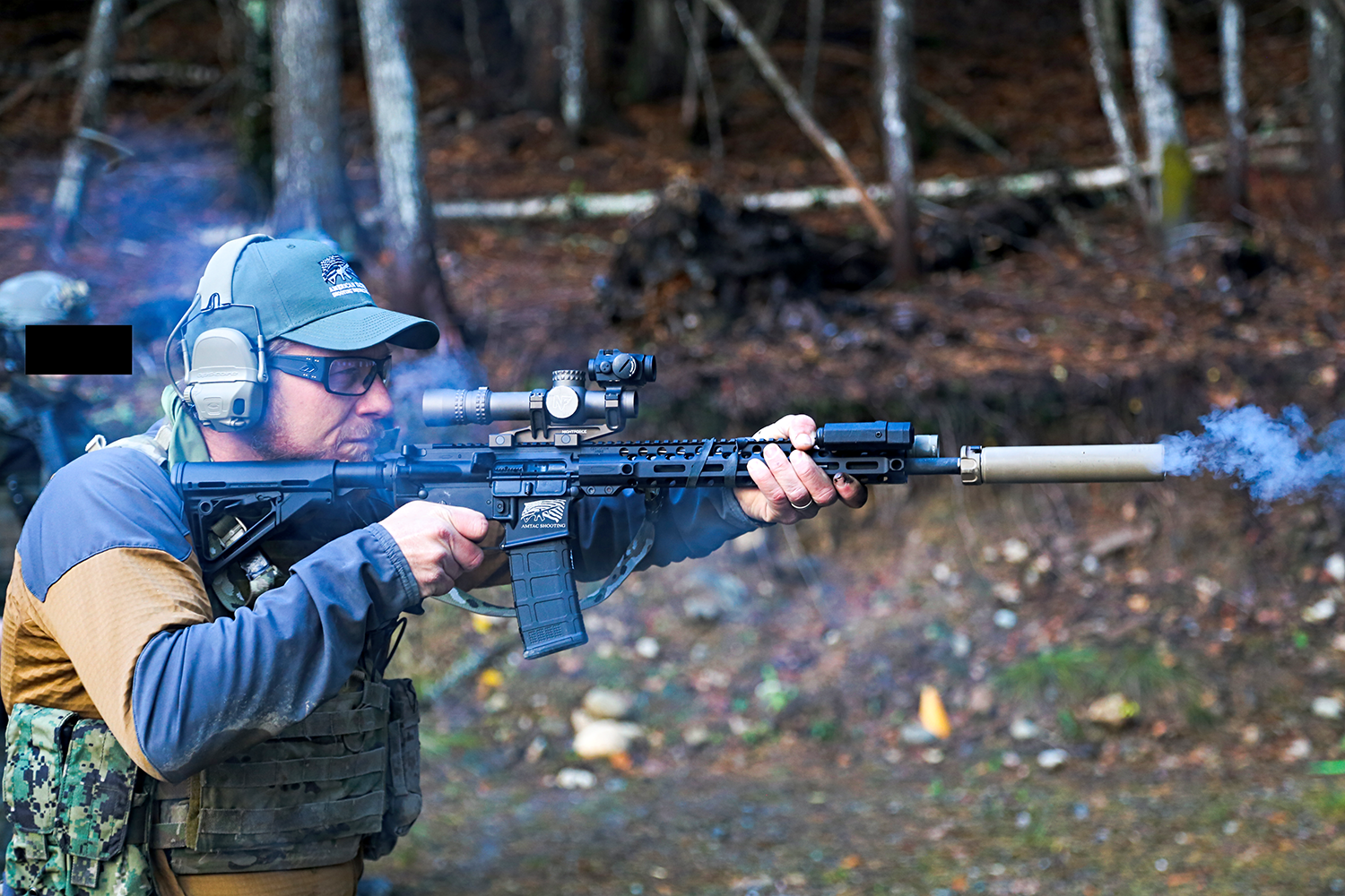 Once the sun came out again, there was a course of steel plates that was setup through trees, on decline. This is important because in a heavy wooded area searching for your target is sometimes tricky. Every student ran through this course of fire, bill demonstrated first.
